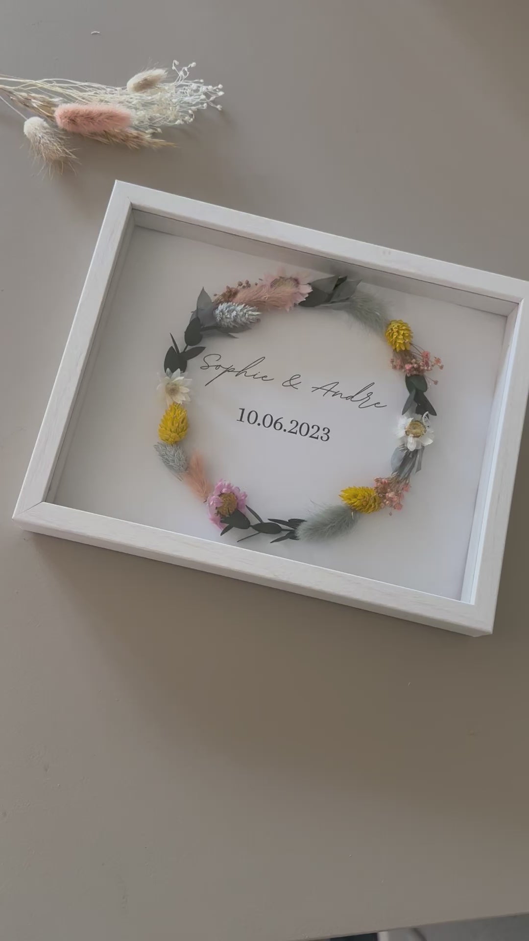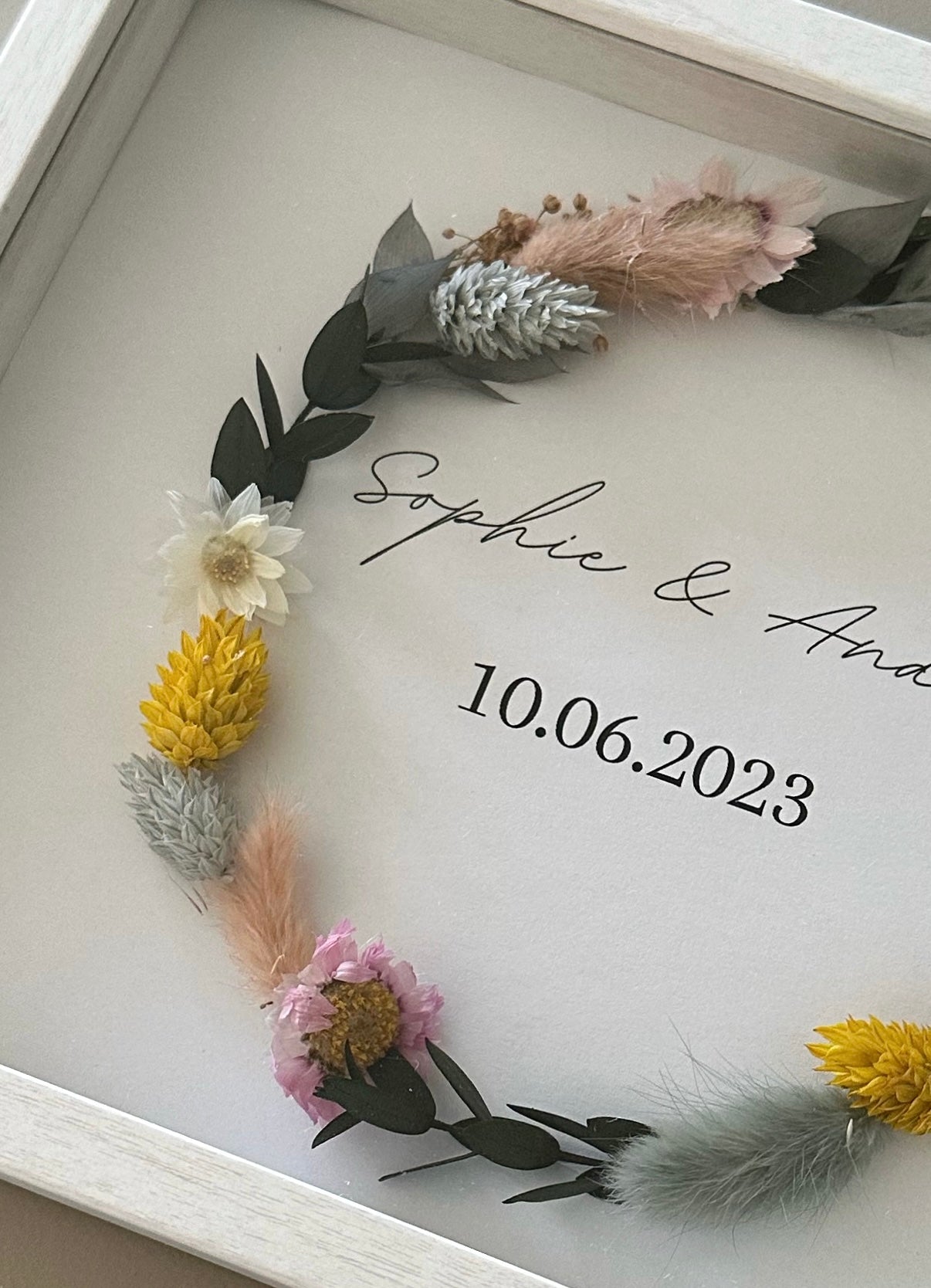 Are you a guest at a wedding this year and would you like to give a unique, personal gift in addition to a monetary gift? Then our customizable picture frame with dried flowers is just the right gift idea for you!