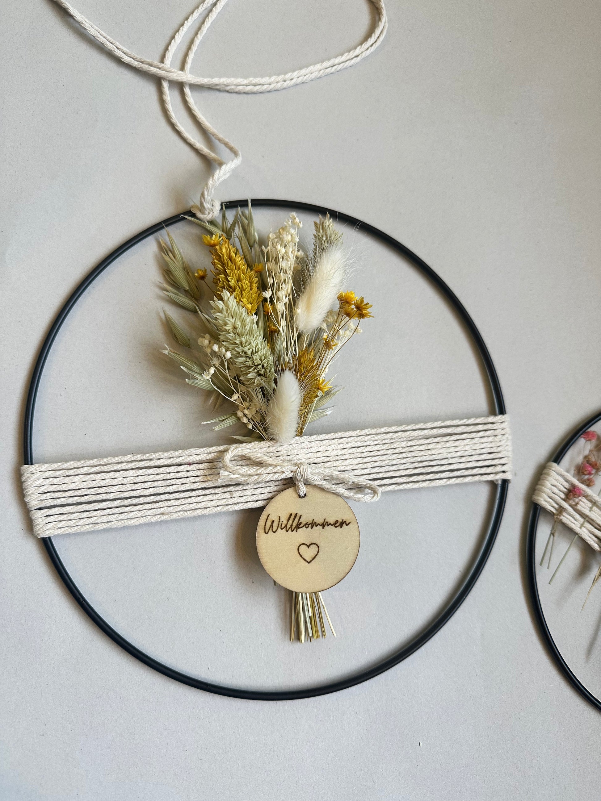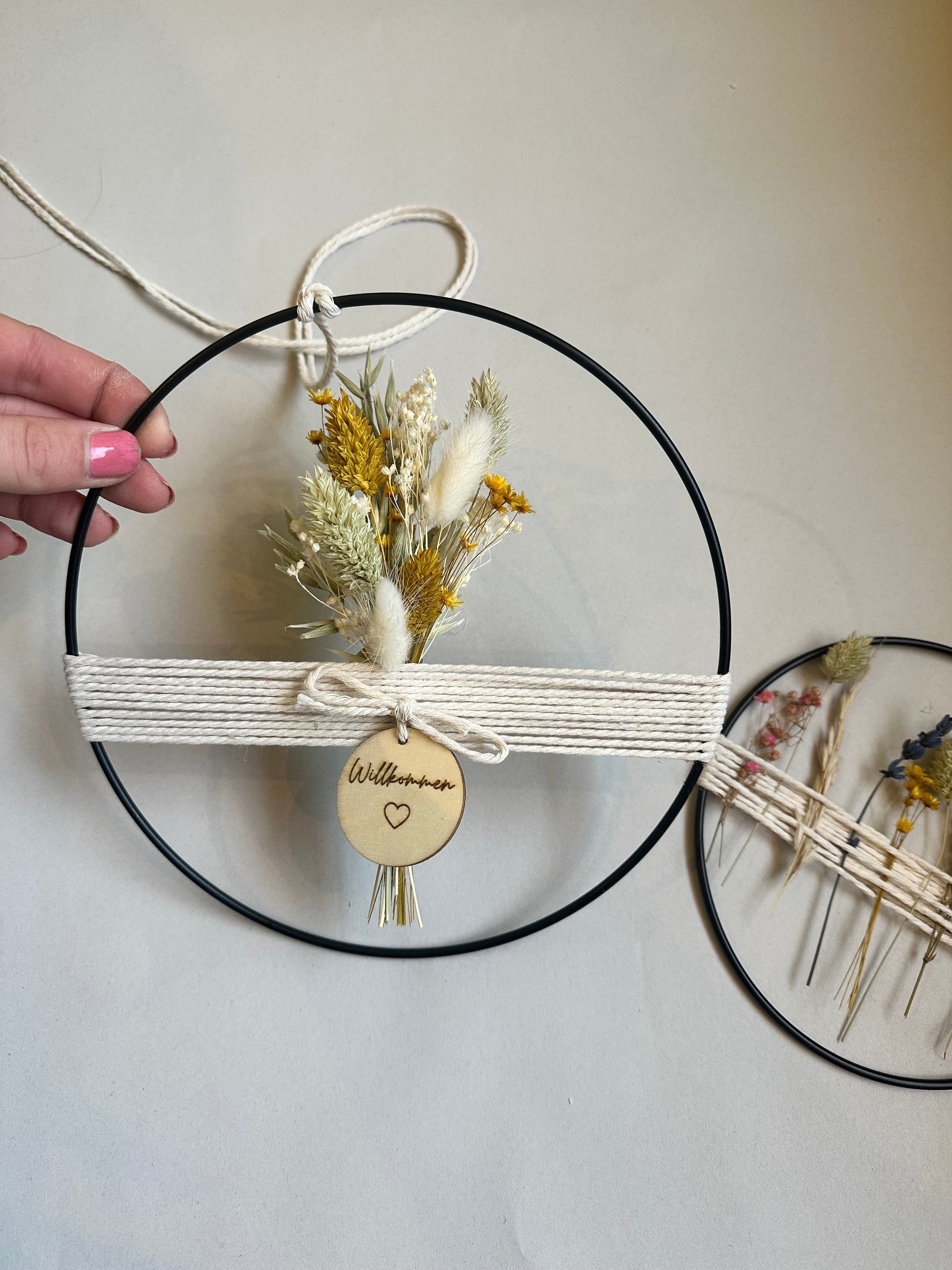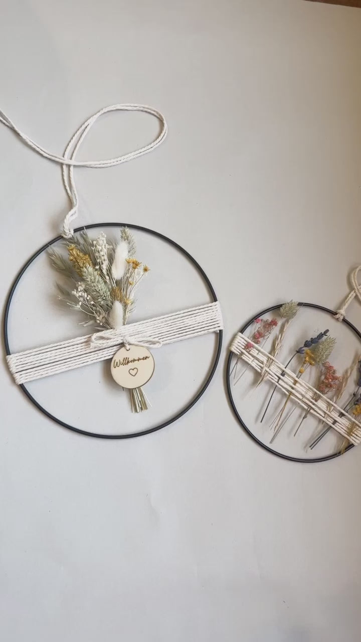 The metal ring wrapped with cotton thread, in which small dried flowers (including Phalaris, Lagurus, Eucalyptus (Babyblue)) are inserted, fits into almost any interior style with its design and can be decorated at any time of the year. The ring with dried flowers will definitely brighten up your window and/or wall decoration and is an absolute eye-catcher. Of course also the perfect gift for your loved ones :)