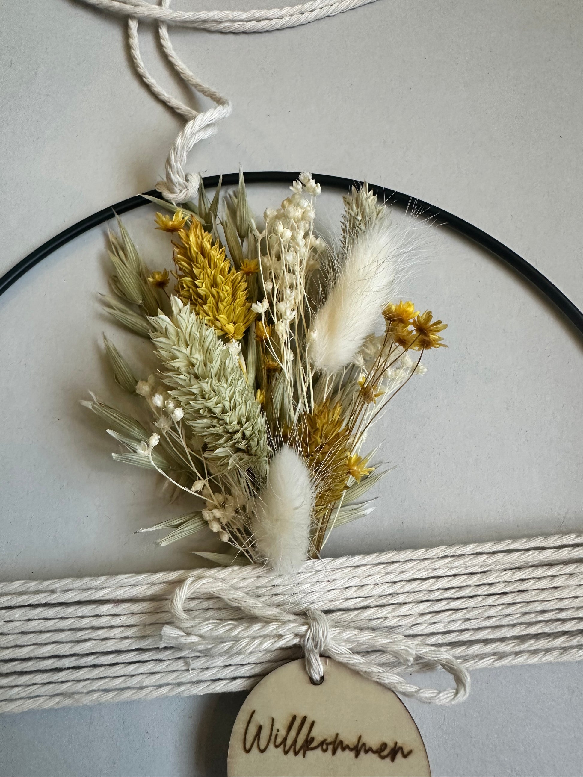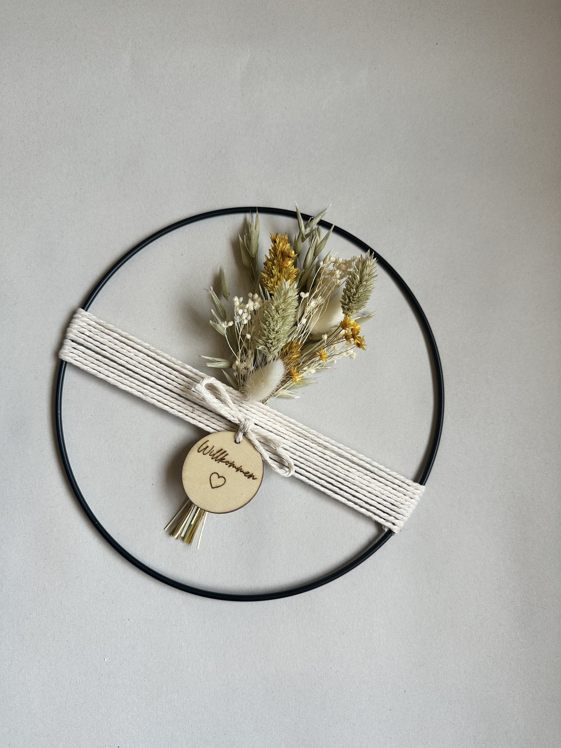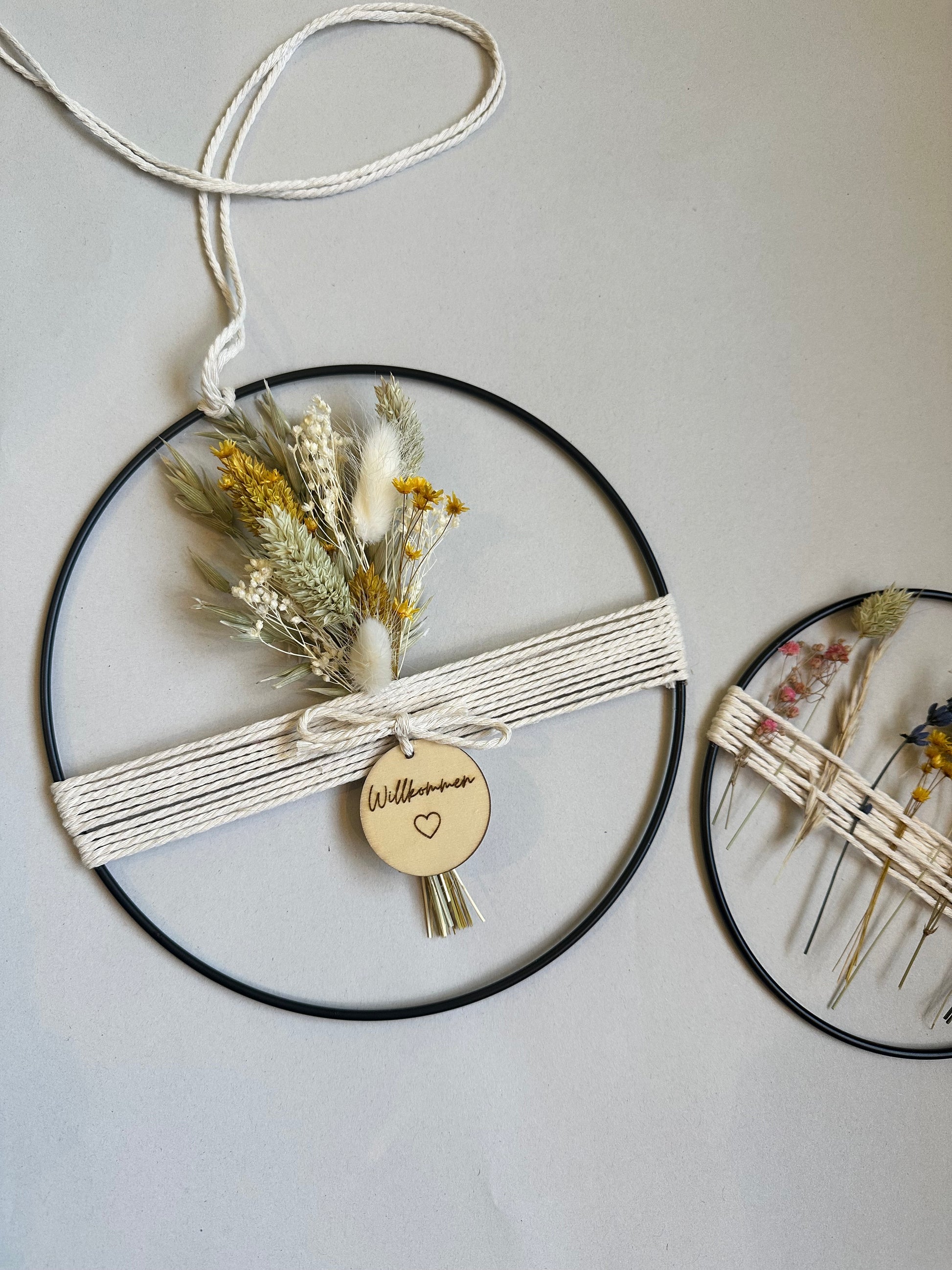 The metal ring wrapped with cotton thread, in which small dried flowers (including Phalaris, Lagurus, Eucalyptus (Babyblue)) are inserted, fits into almost any interior style with its design and can be decorated at any time of the year. The ring with dried flowers will definitely brighten up your window and/or wall decoration and is an absolute eye-catcher. Of course also the perfect gift for your loved ones :)