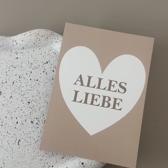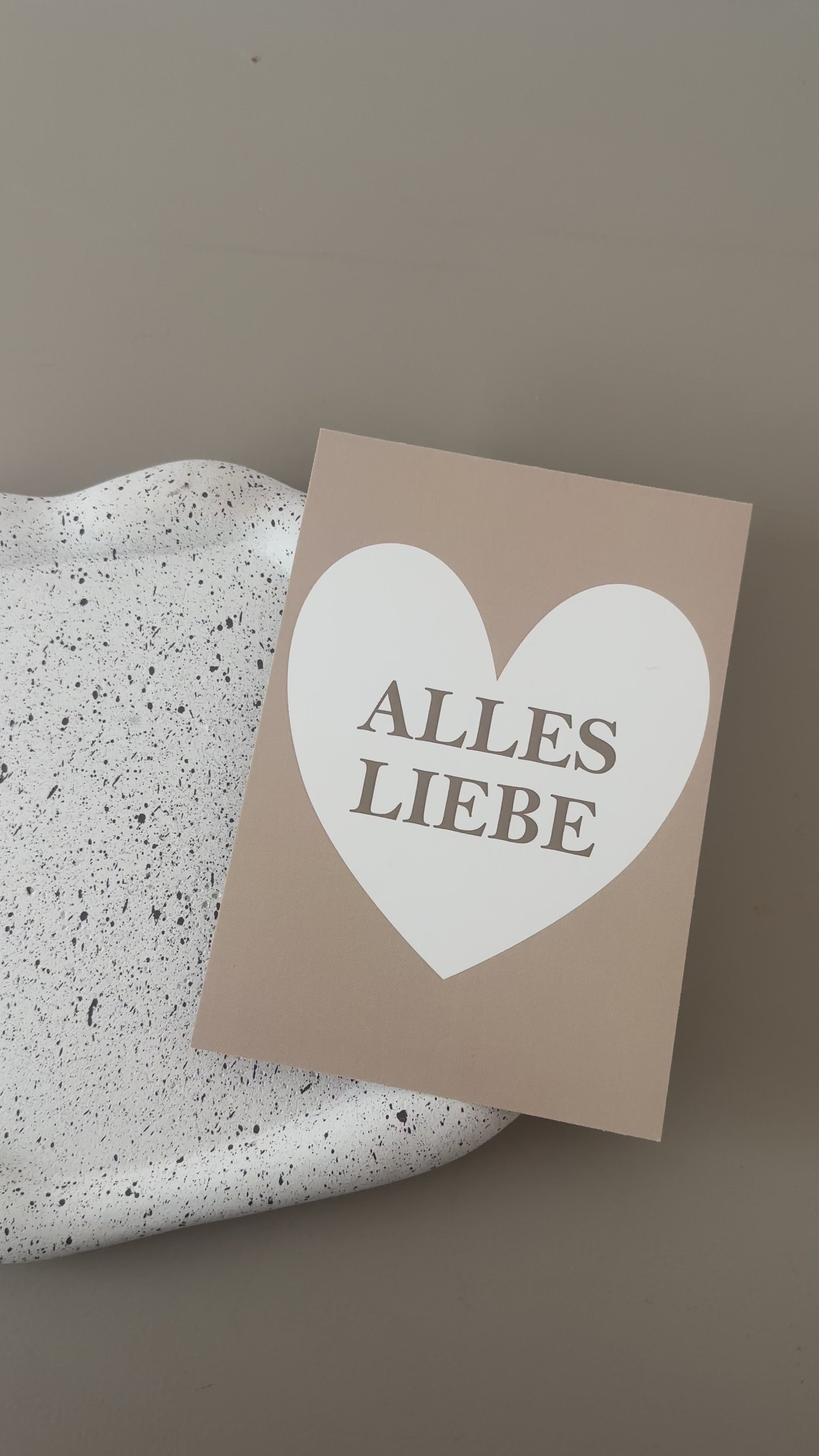 Schöne Postkarte im Hochformat mit großem weißen Herz auf beigefarbenem Hintergrund und der Aufschrift "ALLES LIEBE".