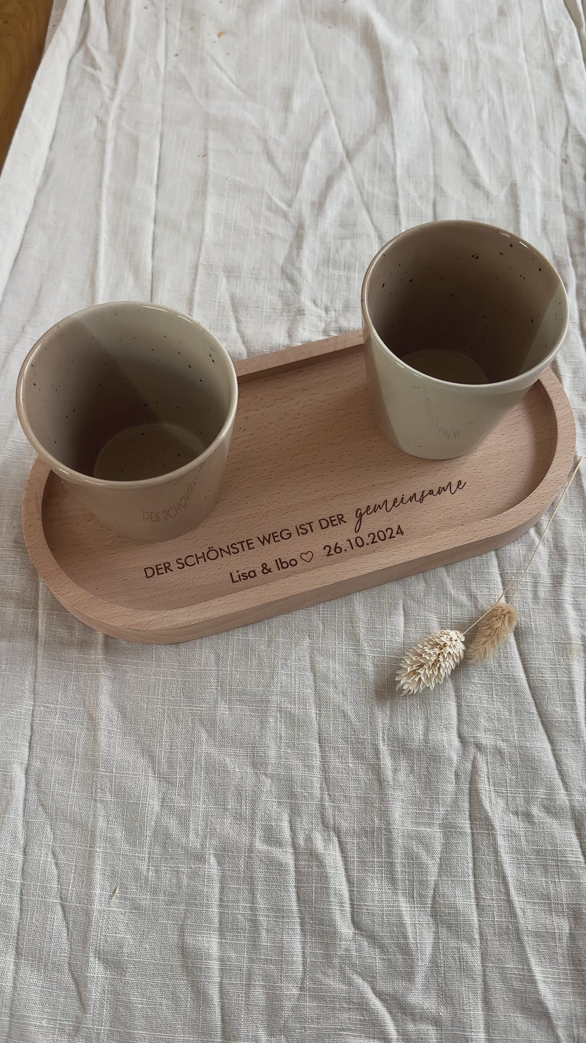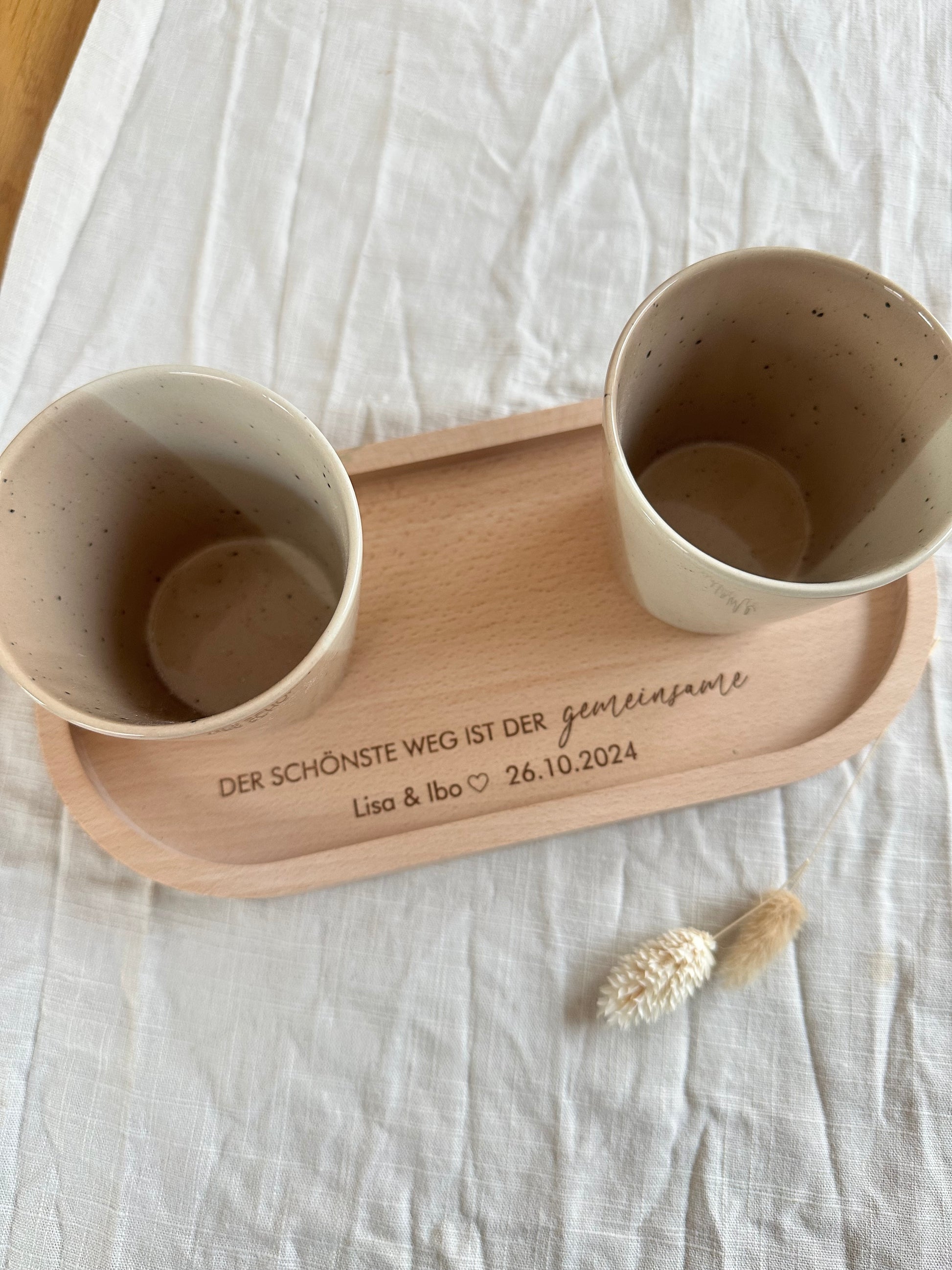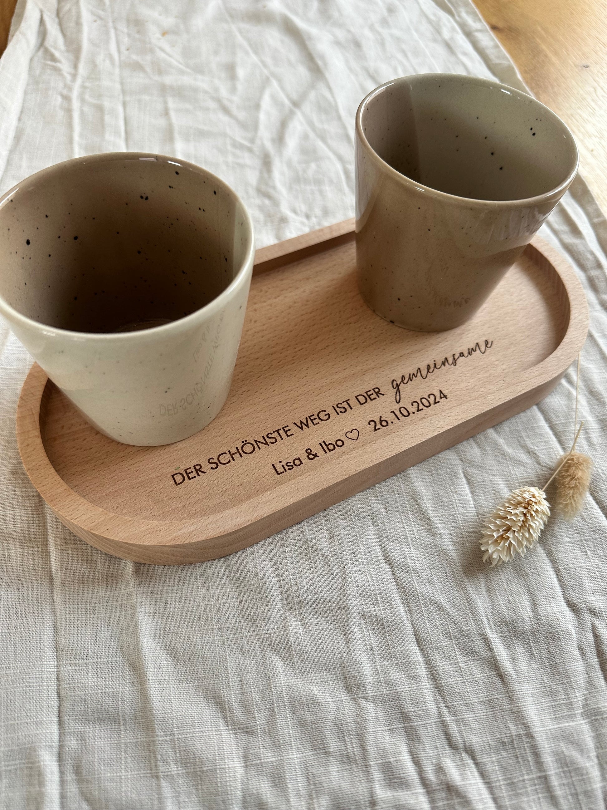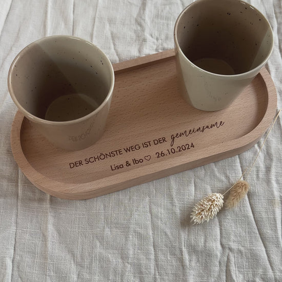 Dieses stilvolle Tablett aus hochwertigem Buchenholz ist mehr als nur praktisch – es bewahrt eine Erinnerung an einen ganz besonderen Moment. Die Gravur „Der schönste Weg ist der gemeinsam“ wird durch die Personalisierung mit Namen und Datum zu einem einzigartigen Andenken.