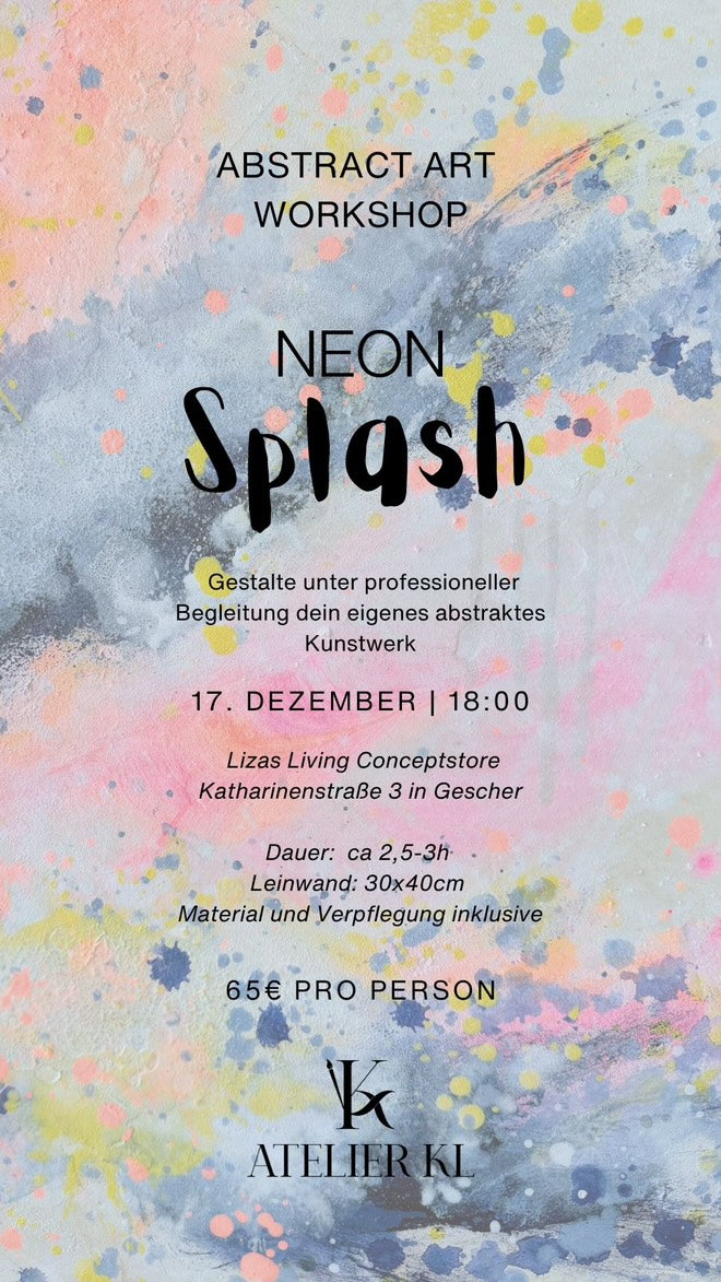 Beim Abstract Art Workshop NEON SPLASH gestaltest du deine eigene Leinwand mit strahlenden Acrylfarben, die sofort gute Laune machen.