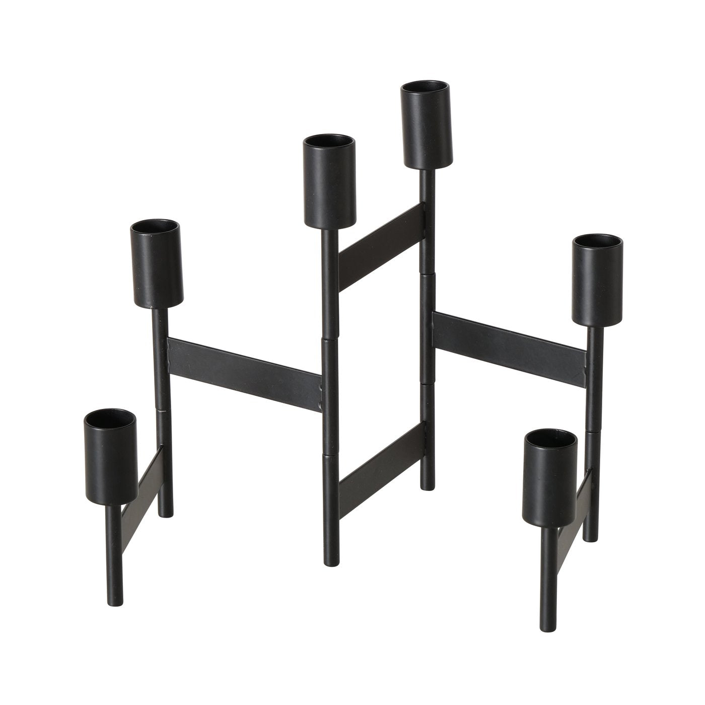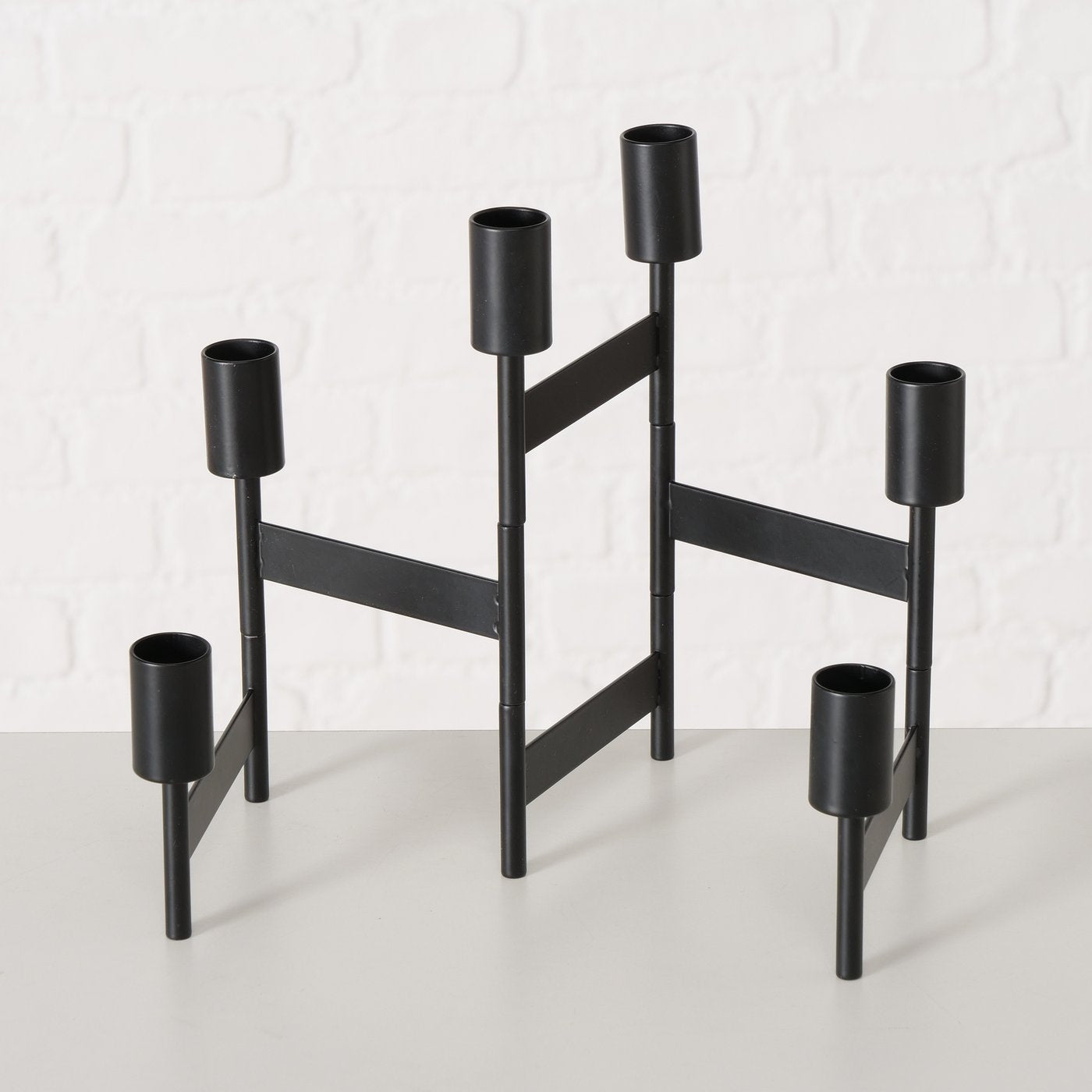 Dieser Kerzenleuchter aus schwarzem Metall überzeugt mit einer klaren, grafischen Formensprache und einer mattierten Oberfläche. Die versetzt angeordneten Arme verleihen dem Design eine moderne Leichtigkeit und machen ihn zu einem echten Blickfang auf Tisch, Sideboard oder Fensterbank.