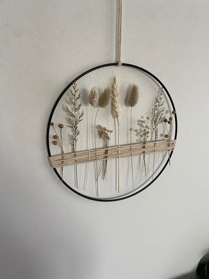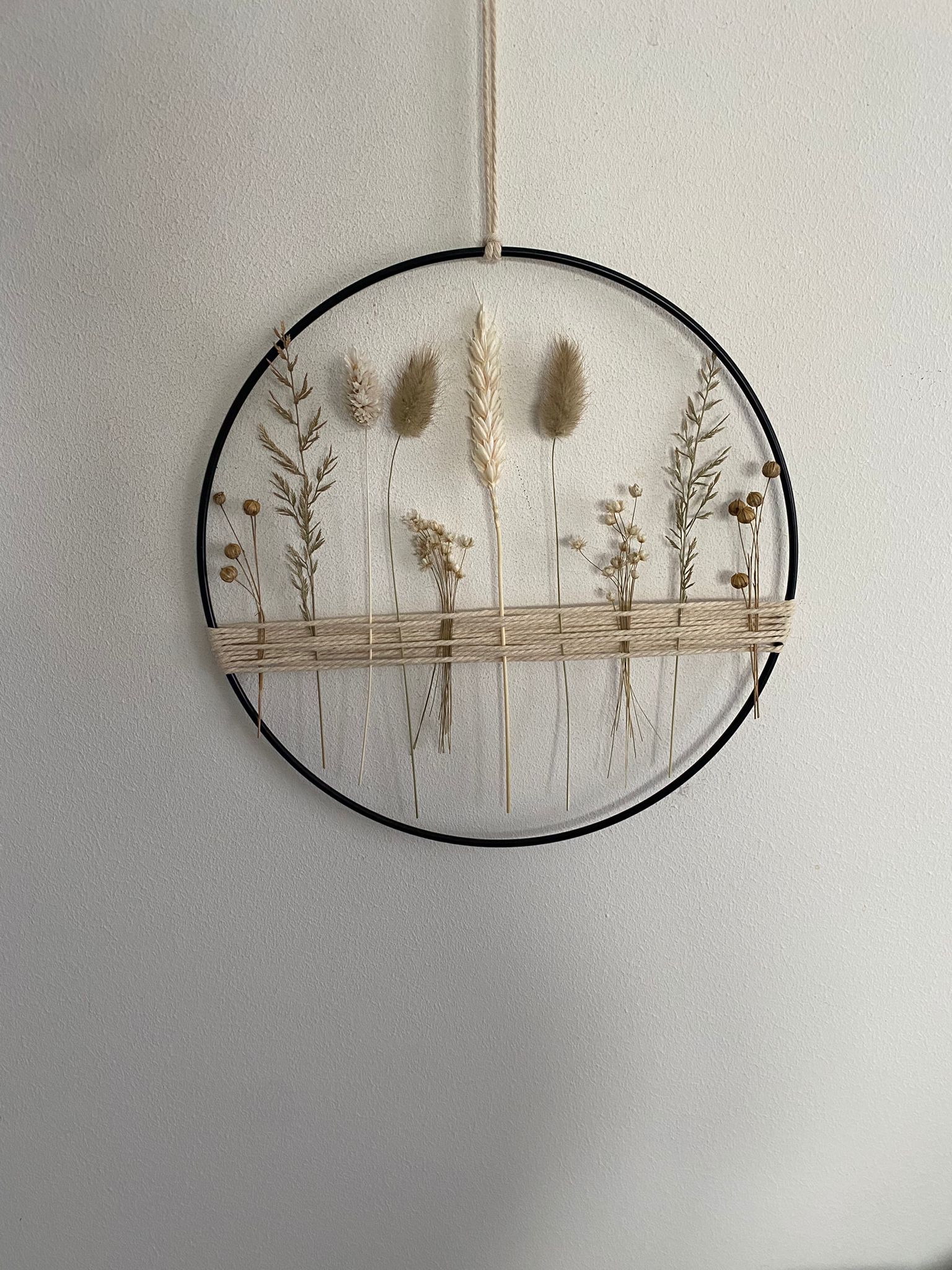 Der Metallring mit dem Baumwollgarn umwickelt, in dem kleine Trockenblumen reingesteckt sind, fügt sich, mit seinem Design in fast jedem Einrichtungsstil, ein und kann zu jeder Jahreszeit dekoriert werden. Der Ring mit Trockenblumen hübscht auf alle Fälle deine Fenster- und/oder Wanddekoration auf und ist ein absoluter Hingucker.