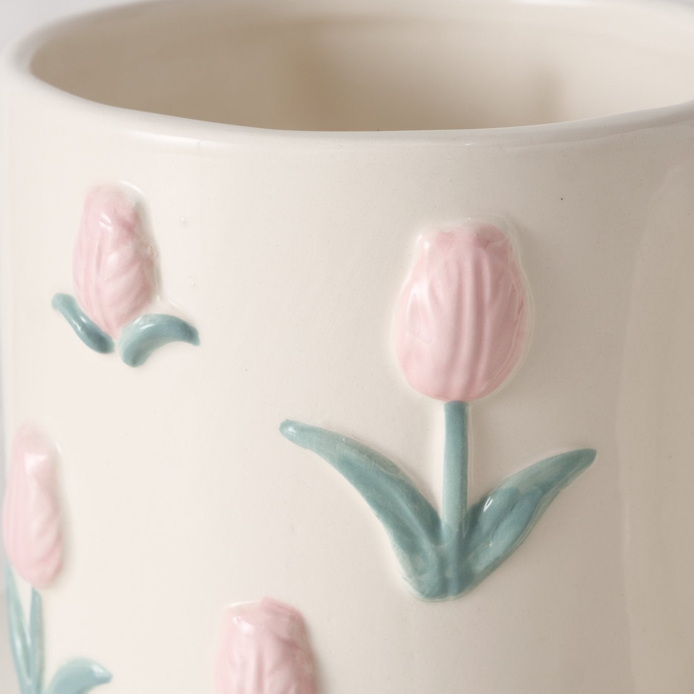 Die Tasse Tulipano aus hochwertiger Keramik überzeugt durch ihr großzügiges Fassungsvermögen von 575 ml und ihr rundes Design. Das liebevoll gestaltete Motiv mit rosa Tulpen verleiht der Tasse einen frischen, frühlingshaften Charakter und macht sie zu einem besonderen Blickfang auf jedem Tisch.