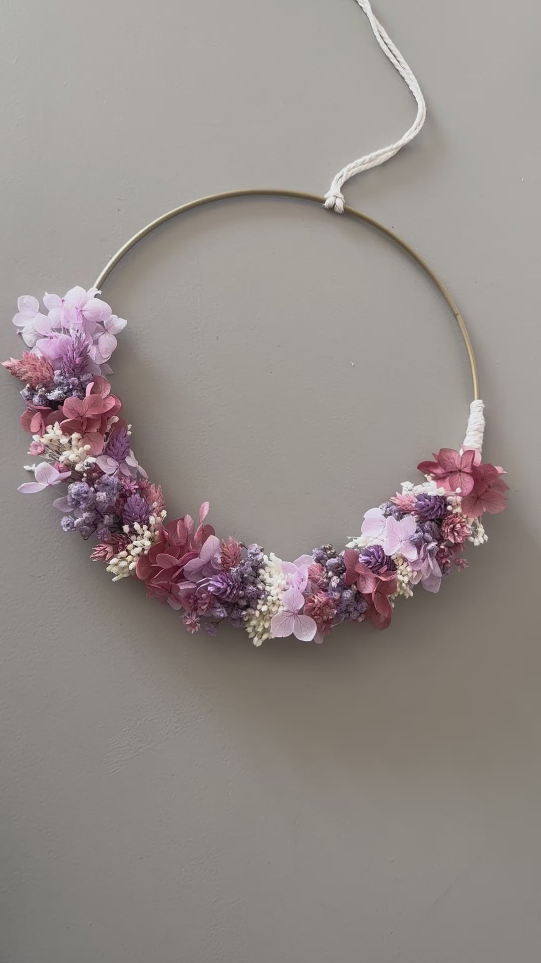 Der angegebene Durchmesser stellt den Metallring dar. Mit den gebundenen Trockenblumen ist er ein paar Zentimeter größer.