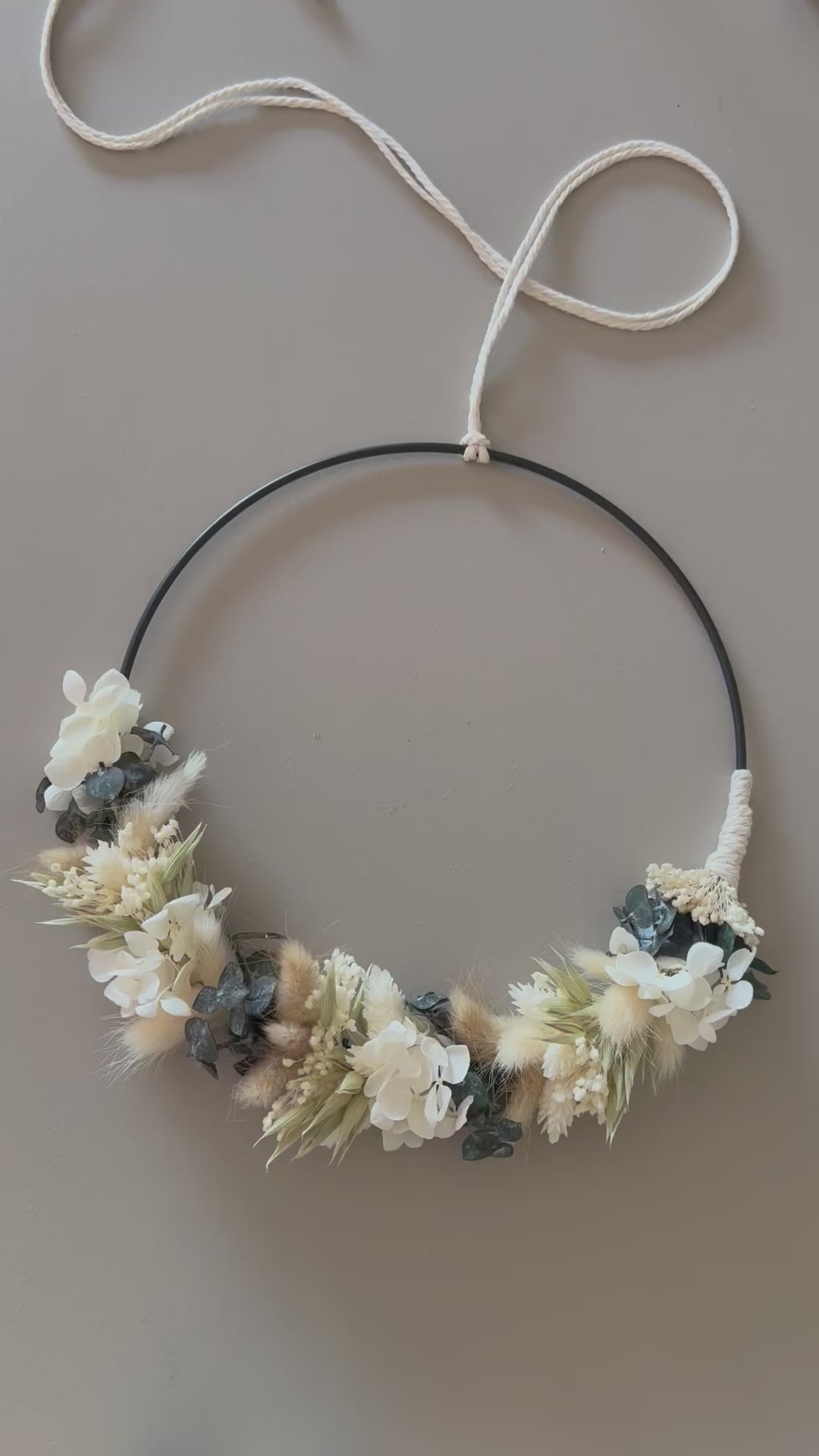 Der schwarze Metallring wird einseitig mit unterschiedlichen Trockenblumen (u.a. Hortensien, Phalaris, Broom Bloom, usw.) gebunden.
